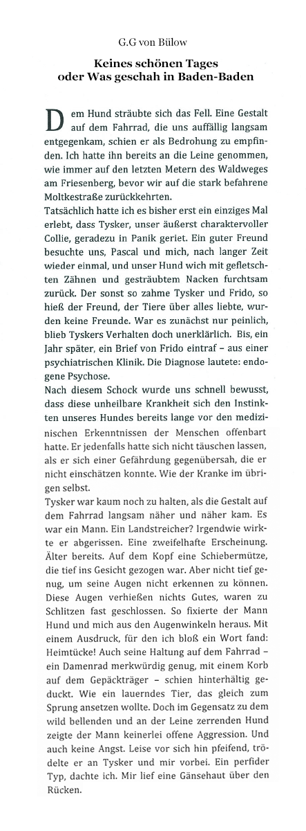 „Keines schönen Tages oder Was geschah in Baden-Baden“ in Anthologie: „Spuk in Hamburg“, Hrsg. Gino Leineweber; Hamburg 2014; ISBN: 978-3-94863-10-9