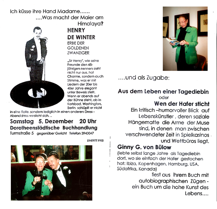 Wir begehen ein Jubiläum: Ginny von Bülow, die unter dem Namen G. G. von Bülow schreibt, ist seit genau 25 Jahren Mitglied der Hamburger Autorenvereinigung. Da ihr auch eine Spielbank nicht gerade unbekannt ist, könnte es keinen beßeren Ort für die heutige Lesung geben, als diesen.